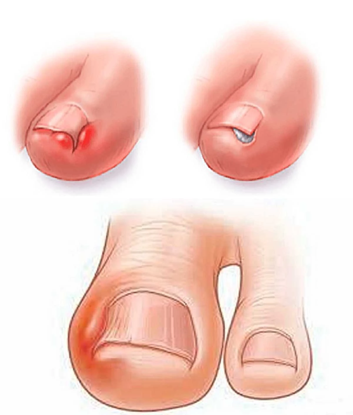 An ingrown nail occurs when the edge of the nail starts to press into or grow into the surrounding skin. It most often happens to the big toe. The main causes include: