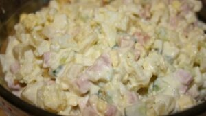 Homemade diet Olivier salad with chicken, vegetables and yogurt dressing recipe