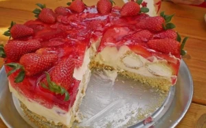 Cream puff cake with strawberries and egg liqueur – light and quick dessert