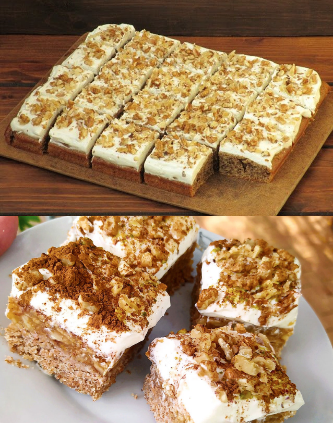 • Cream preparation and decorating: Whip the cream with the powdered sugar until stiff. After the cake has cooled, spread the cream over the surface. Finally, sprinkle with chopped walnuts.