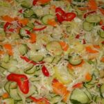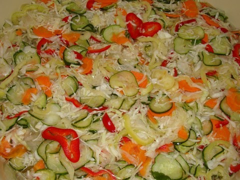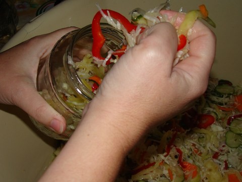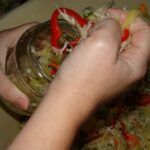 - Then we press the vegetable mixture into sterilized canning jars up to the rim and pour the juice from the vegetables into each jar and close the jars well.