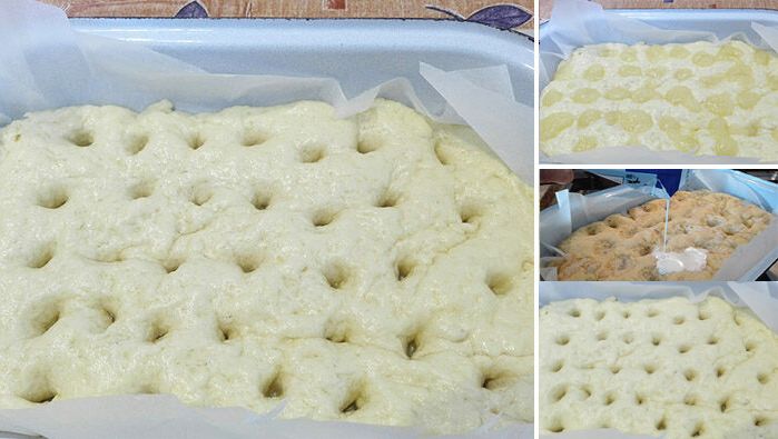 - Shaping the cake: Layer the prepared dough into the pan and spread it evenly. Rub your hands with oil and gently press the dough into the pan. Let it rise for another 30 minutes.