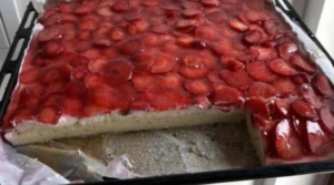 • Spread the apple mixture over the pre-baked dough. Whip the egg whites with the sugar until stiff, fold in the pudding powder and spread over the apples.