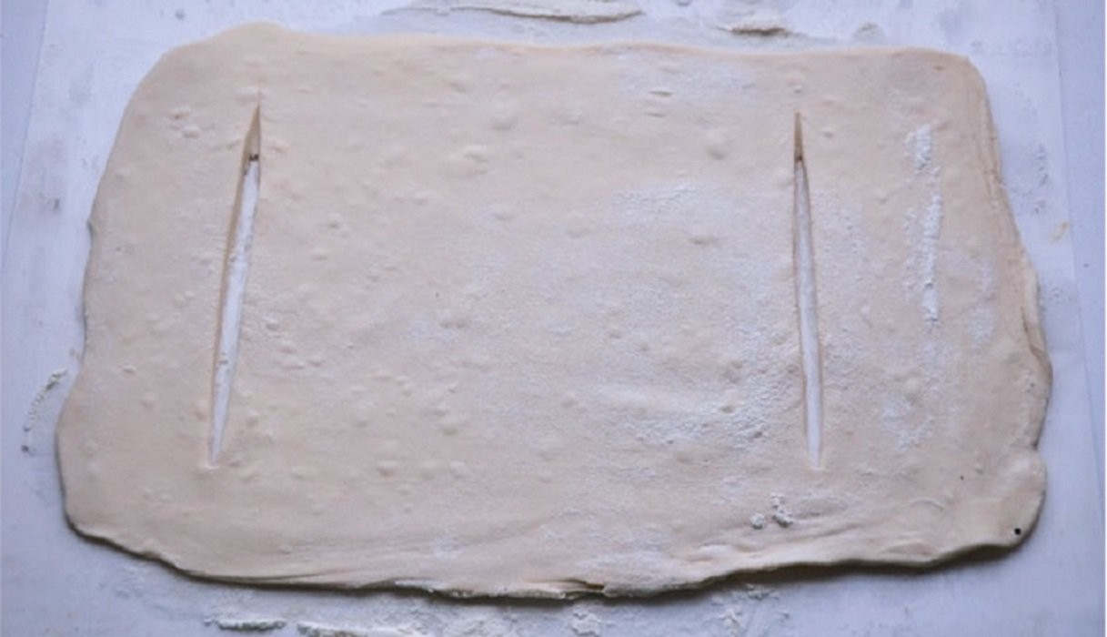 - Shaping the boats: Divide the puff pastry into four parts and roll each part into a rectangle. Make cuts on the edges of the dough, place 2–3 tablespoons of mash, meat and a few pieces of cucumbers in the center. Fold the dough so that the cuts are on top, and shape the edges into a boat shape.