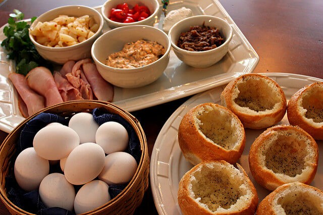 - Preheat the oven to 180 degrees. Cut off the tops of the rolls and hollow out the insides. Brush the inside of each roll with melted butter and sprinkle with salt and pepper.