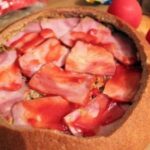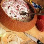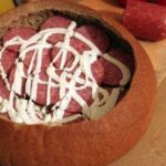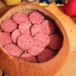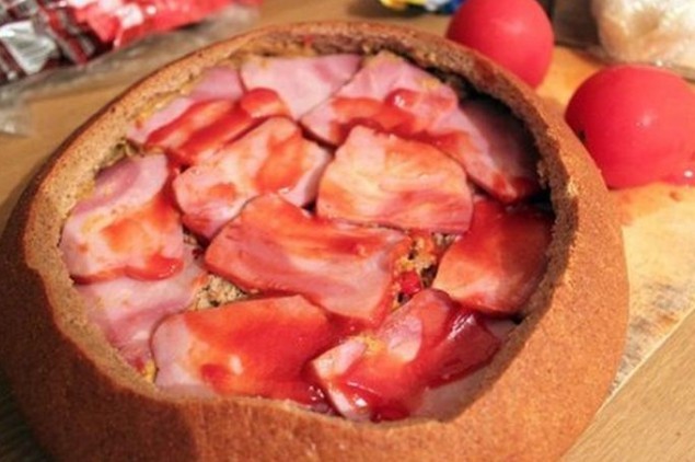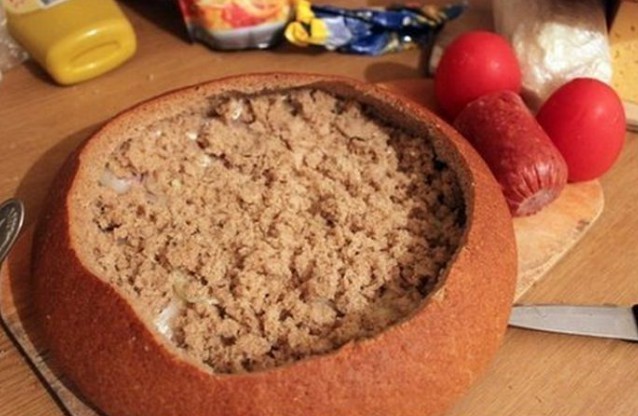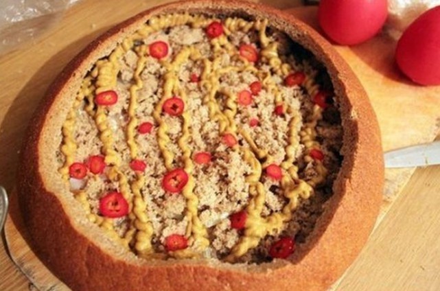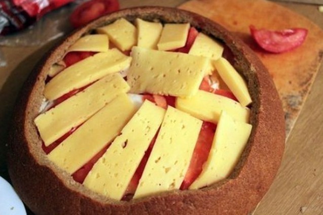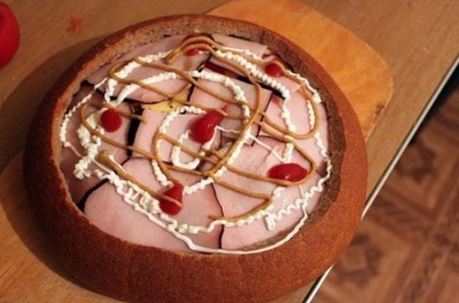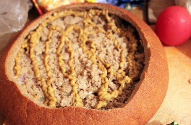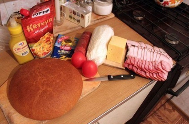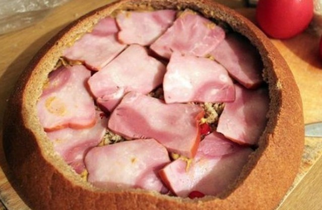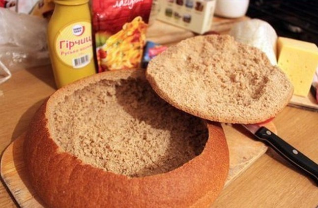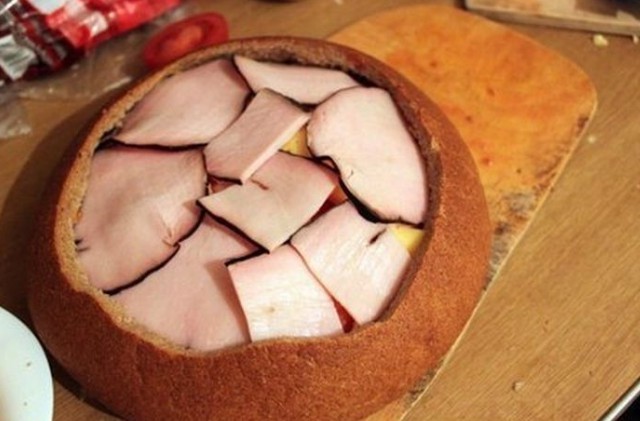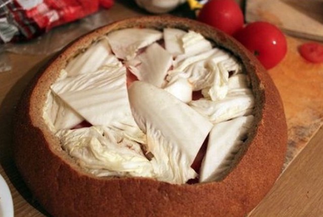 3. On the bottom of the bread place slices of salami, spread processed cheese, arrange thinly sliced onion, pile half of the hollowed-out bread center, spread mustard, add small pieces of chopped chili, slices of bacon or smoked ham, then layer the bread again, mustard, sliced tomatoes, hard cheese, bacon or smoked ham, spread it with ketchup, top with Chinese cabbage, ham and spread all of that with processed cheese, ketchup and mustard.
