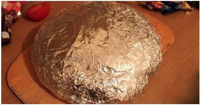 4. Cover it with the piece of bread you cut off and wrap the whole thing in aluminum foil. Press it firmly.