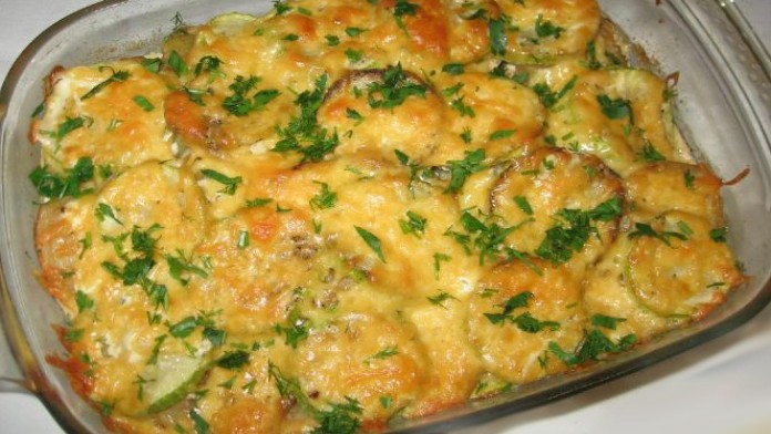 Baked potatoes with zucchini sprinkled with grated cheese and parsley! recept