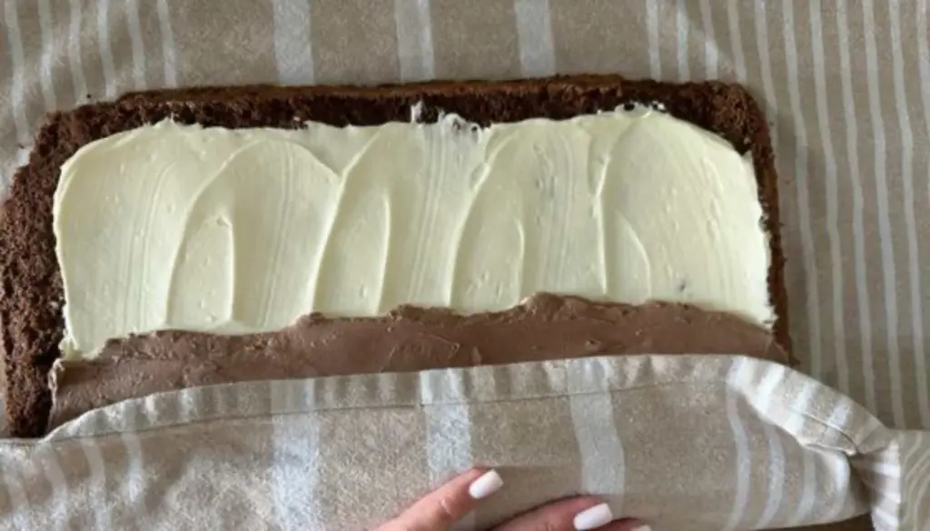 • Transfer the sponge to a clean towel, peel off the paper and spread the white cream over the entire surface. Spread the cocoa cream over only two-thirds of the surface. Place whole bananas at the edge and, using the towel, roll the roulade tightly.