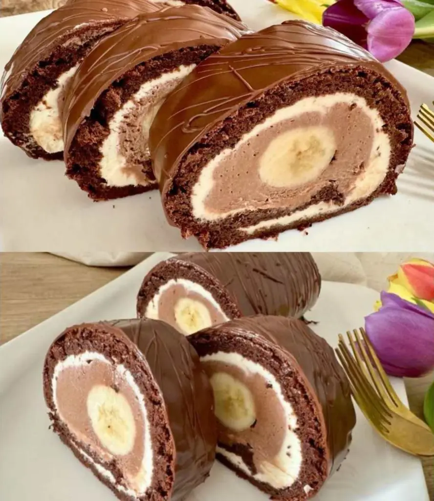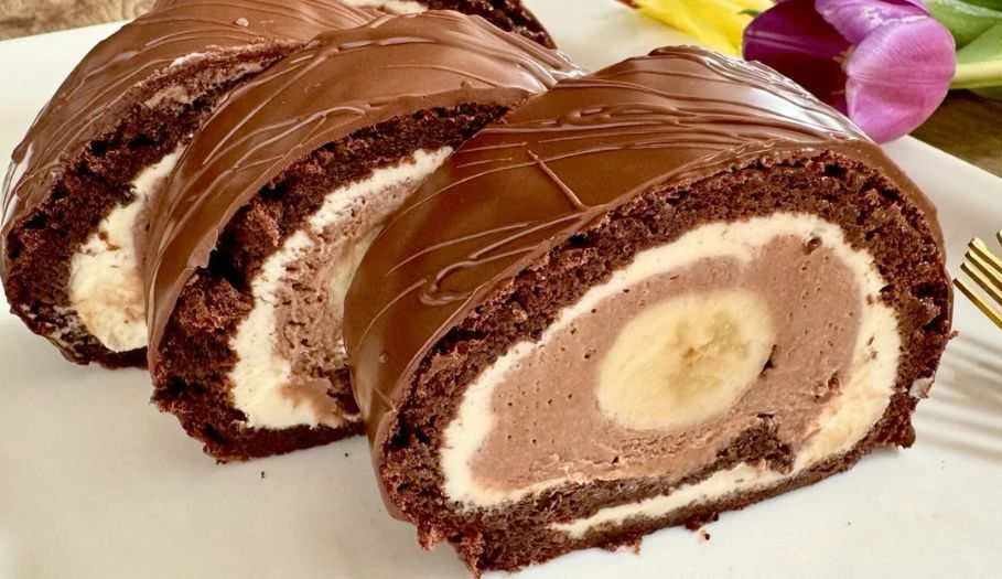 The banana roll is one of those desserts that always succeeds. A fluffy cocoa sponge without flour, a delicate cream of mascarpone, whipped cream and vanilla, complemented by fresh bananas, form a harmony of flavors that is ideal with coffee or for a festive gathering. Preparation is easy and the result is exceptionally delicious.