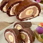 Banana roll with mascarpone is a dessert that will delight any lover of creamy pastries. Because the batter contains no flour, it is exceptionally airy and delicate. The banana inside adds delicious juiciness and the chocolate glaze nicely completes the overall flavor profile. It is suitable for family celebrations, festive gatherings, and a regular Sunday at home.