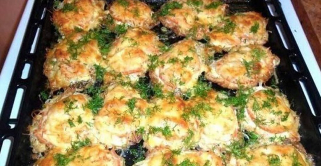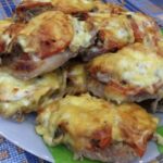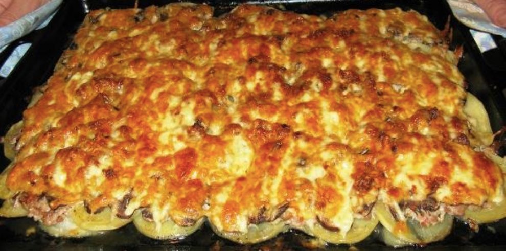 • Place half of the potatoes in it, sprinkle with pepper, put half of the meat on the potatoes, a layer of onion, and finally half of the mayonnaise with the cheese.