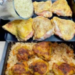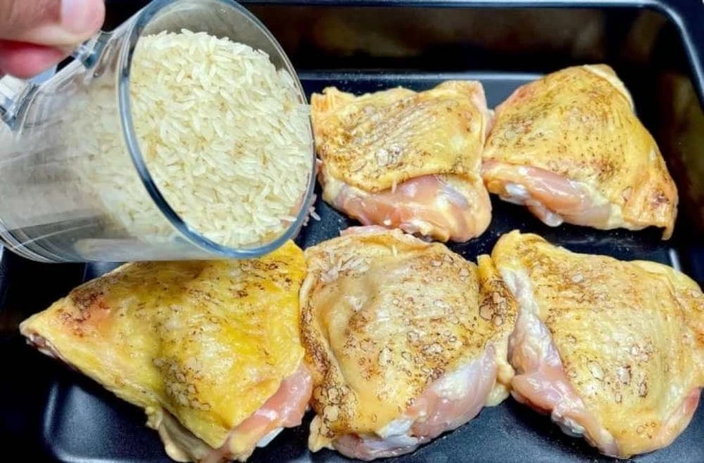 • Finishing the dish: After baking, remove the chicken thighs from the tray and add the cooked rice to the drippings. Mix well so the rice is coated in the drippings and absorbs the flavor.
