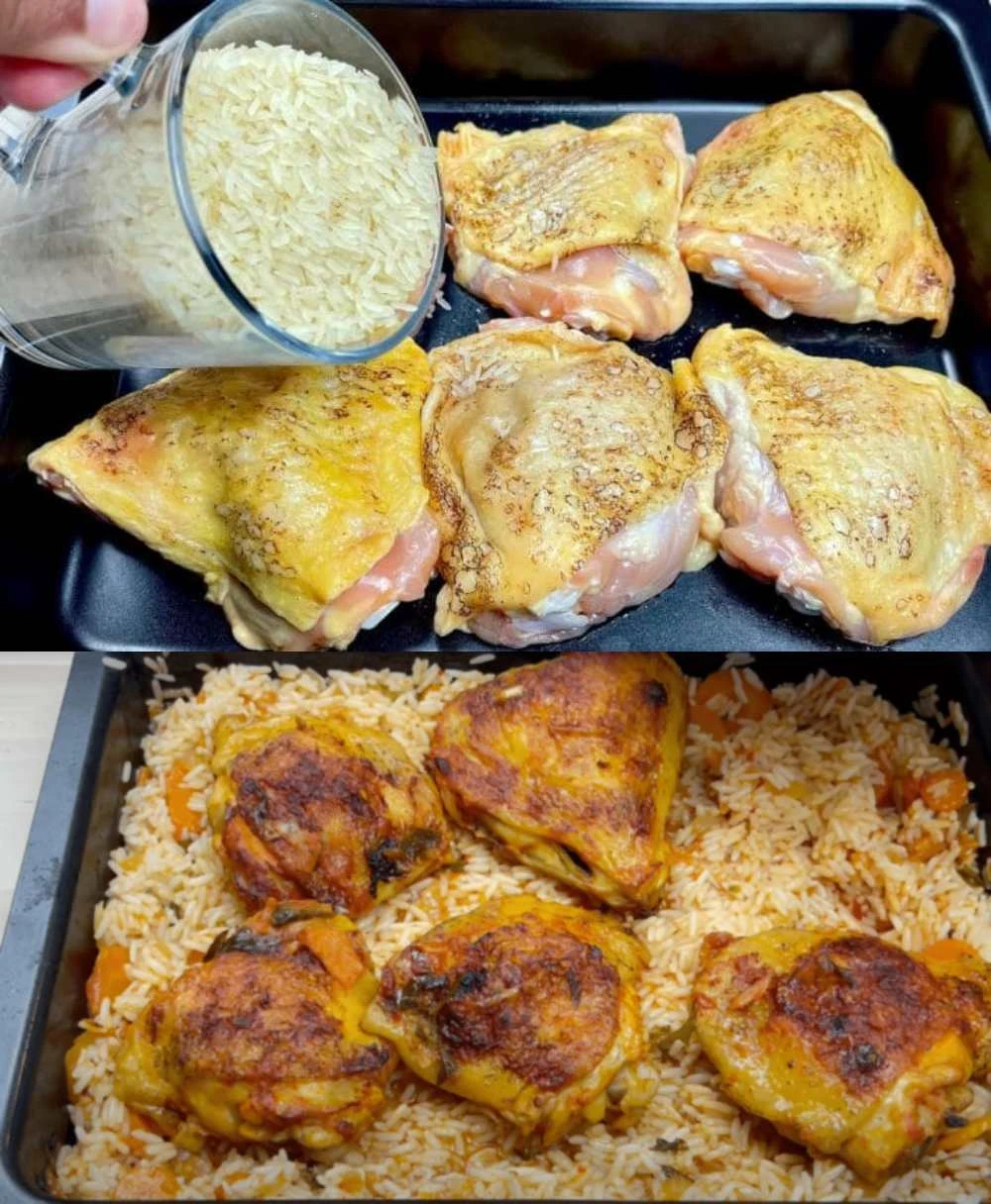 • Finishing the dish: After baking, remove the chicken thighs from the tray and add the cooked rice to the drippings. Mix well so the rice is coated in the drippings and absorbs the flavor.