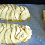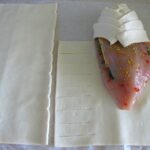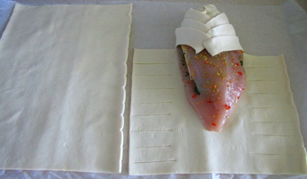 • Wrapping in puff pastry: Divide each sheet of puff pastry into two parts to get 6 pieces. Cut strips into the sides of each pastry piece. Place one stuffed chicken breast in the center and then fold the individual pastry strips over the meat so it is completely wrapped.