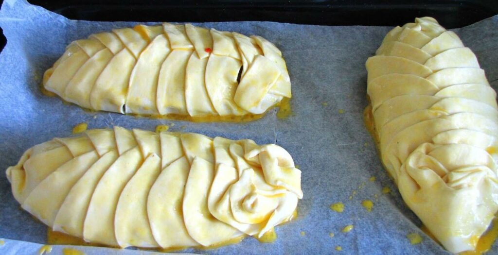 • Baking: Transfer the wrapped chicken breasts to a baking tray lined with parchment paper. Brush them with the beaten egg and bake in a preheated oven at 200 °C for about 40 minutes, until the pastry is golden.