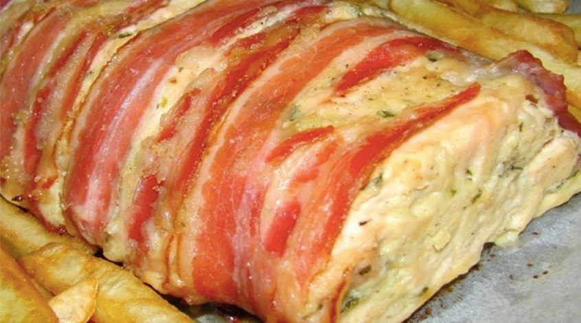 • Arrange half of the slices on the prepared bacon, pour in all of the cream mixture and finally cover with the remaining chicken meat.