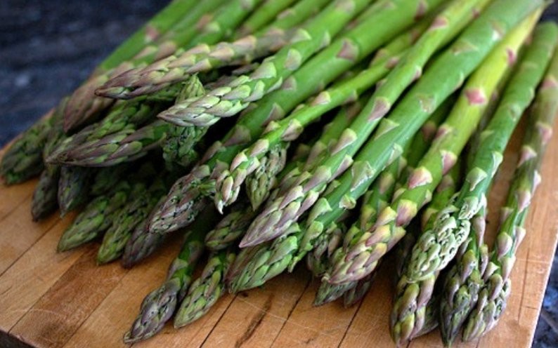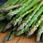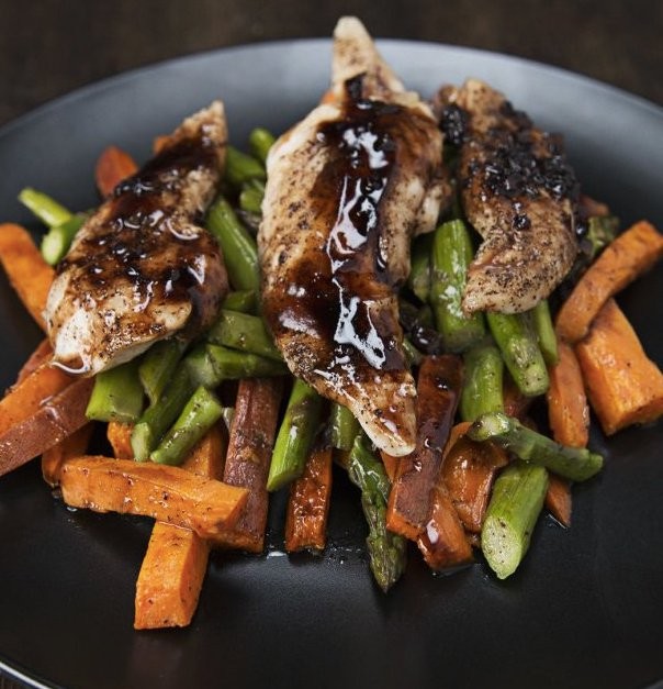 - We salt and pepper the chicken and place it on top of the asparagus and sweet potatoes.