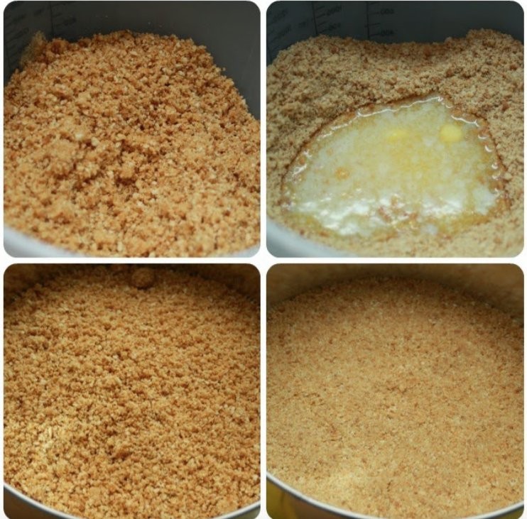 • In a blender, blend the biscuits, then add 150 g melted butter and work it in thoroughly.