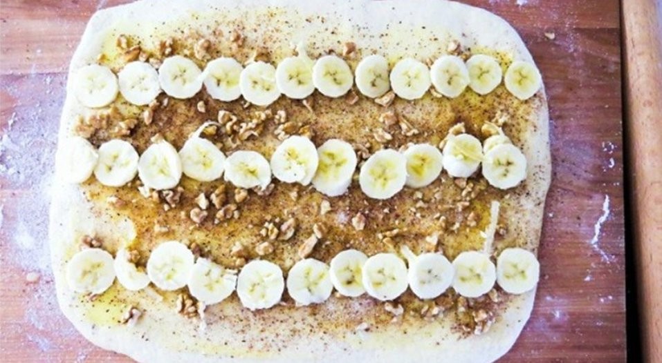• Slice the bananas into thin rounds and arrange them on the dough.