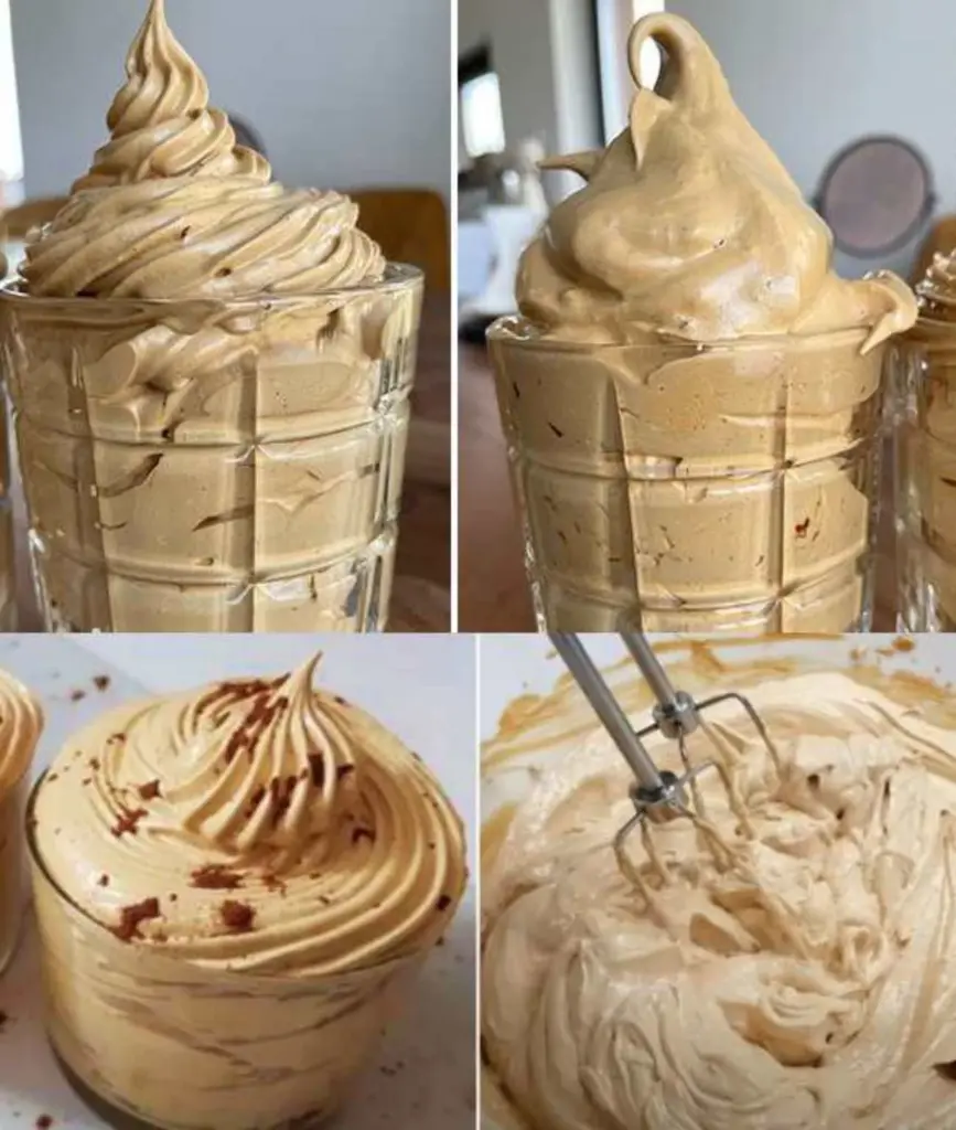 The coffee cream made from three common ingredients is ideal when you need to quickly prepare an elegant sweet finish. Its airy texture, pronounced coffee flavor, and no cooking make it a perfect garnish or a standalone mini dessert in glasses. Just chill the water, turn on the mixer, and you’ll be serving in no time.