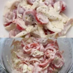 This cold tomato, onion and cheese salad is a great quick summer dish that combines fresh vegetables with cheesy flavor and a creamy dressing. Thanks to the short preparation and chilling, you’ll have a refreshing dish in no time that will please the whole family and guests.