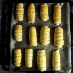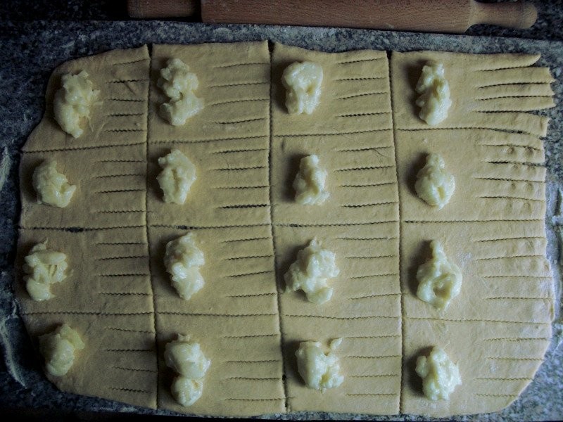 - 4. Shaping the rolls: Roll the risen dough into a rectangle approximately 25 × 35 cm. Cut into 16 squares. On one side of each square make slits across the entire width. Put an appropriate amount of pudding into each square and roll so that the slits form the top of the roll.
