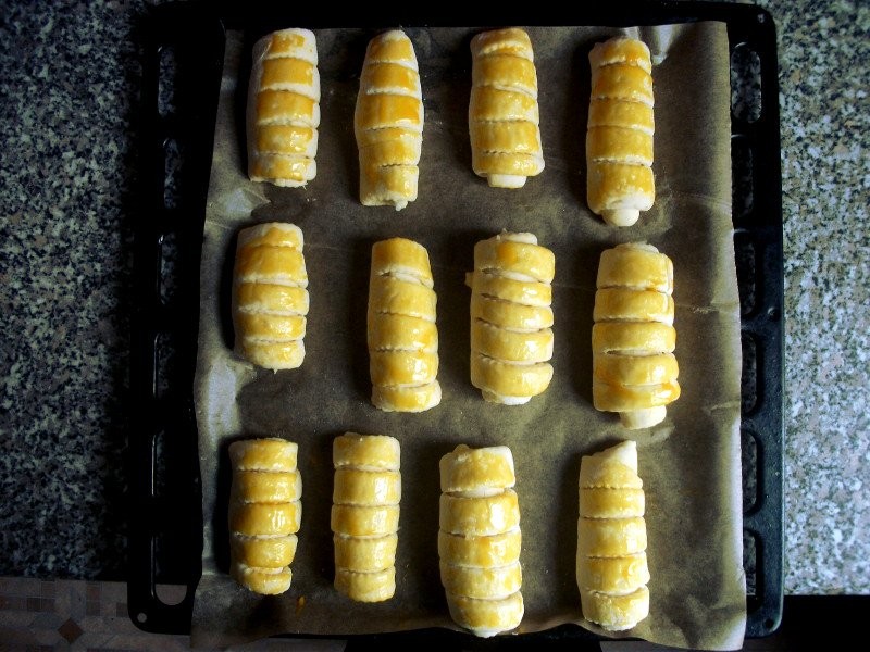 - 5. Baking: Line a baking sheet with parchment paper and place the rolls next to each other. Beat the egg yolks and brush each roll on top. Let them rise on the sheet for another 20 minutes.