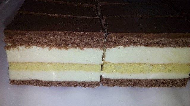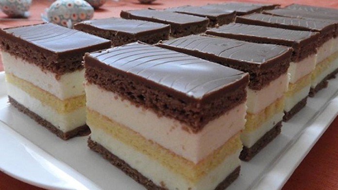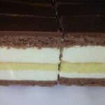 - Assembling the dessert: Spread a layer of the egg-white cream onto the bottom part of the cocoa layer. Then add a thick layer of the yellow pudding cream and let it cool for a while. On top of the pudding layer, add the remaining egg-white cream and cover with the second part of the cake. Drizzle the dessert with the melted chocolate, which you prepared earlier in a water bath, and smooth the surface.