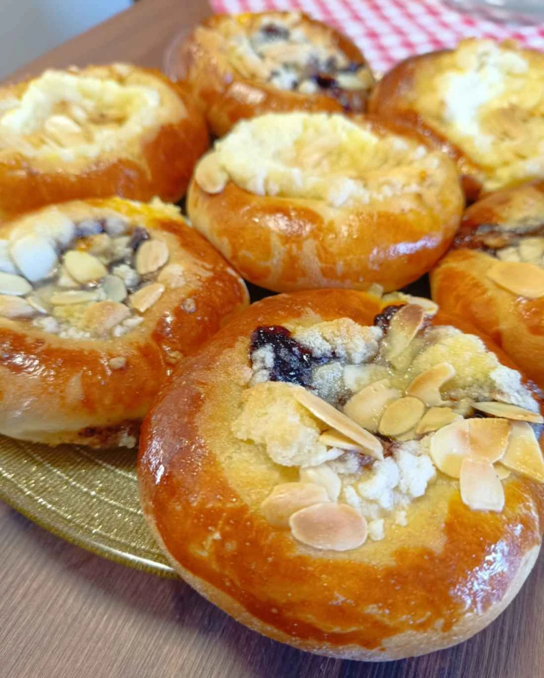 • Shaping the pastries Divide the risen dough into 12–15 equal buns. Let them rest under cling film for 10 minutes. Roll each bun into a patty, place a tablespoon of the quark filling and a tablespoon of plum jam in the center. Fold the edges down – seam side down – and flatten into the shape of a pastry.