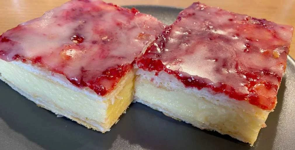 An elegant dessert made from accessible ingredients that looks like it’s from a patisserie yet you can make it at home. Two crisp sheets of puff pastry, a light butter-vanilla cream based on pudding, a thin layer of jam on top and a fresh lemon glaze. Great for celebrations and Sunday coffee.