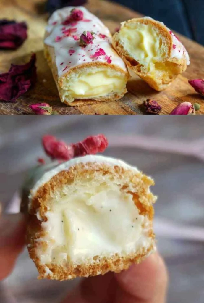 If you enjoy sweet pastries that combine a delicate cream with crisp pastry, French éclairs with vanilla cream will surely enchant you. This excellent dessert is filled with homemade custard cream made with real vanilla and covered with a sugar glaze. Prepare this delicious dessert and let yourself be carried away by its delicate flavor!