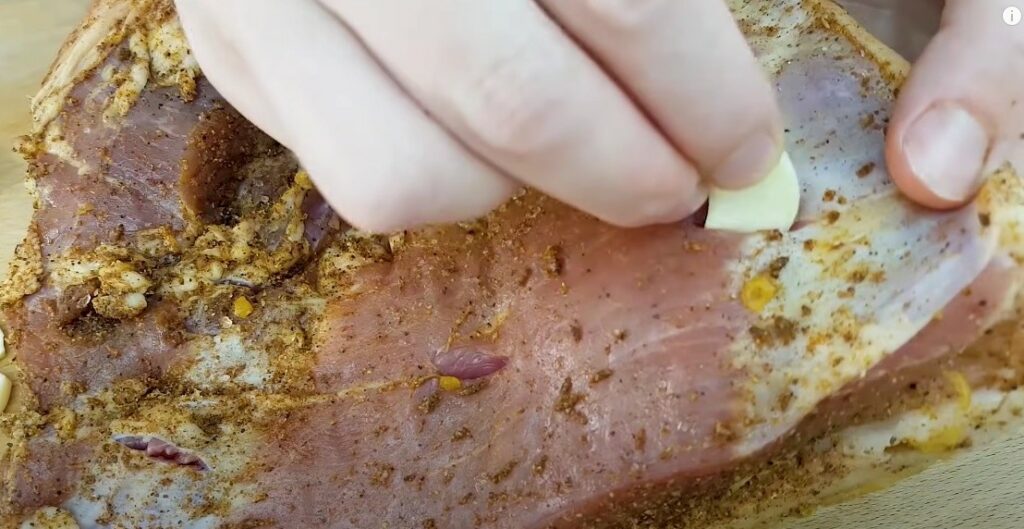 • Then make a few slits and insert garlic cloves into them.