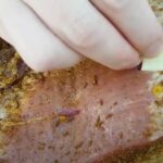 • In a bowl, add salt, black pepper, ground red paprika, and dried garlic and mix. Sprinkle this mixture over the meat all over the surface and into the slits.