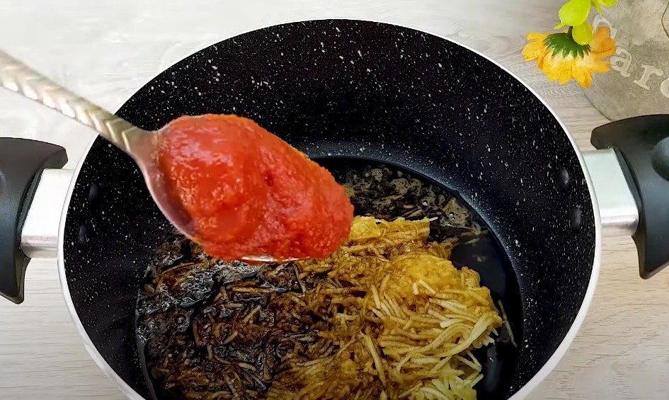 • Meanwhile, prepare the marinade. Peel and grate the apple. Mix it with the soy sauce, tomato paste, and lemon juice.