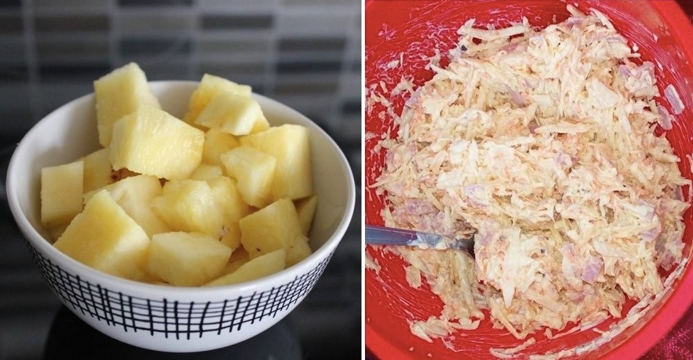 - Put all the fruit and vegetables into a bowl and mix them with either mayonnaise or plain yogurt