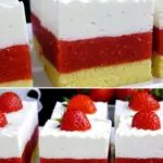 These strawberry slices with whipped cream combine the best of summer desserts: a light sponge, intense strawberry flavor and a fluffy cream. Thanks to the gelatin they hold a beautiful shape and cut well, so they are suitable for festive tables. Prepare them a day ahead – the flavors will meld and the slices will be even better.
