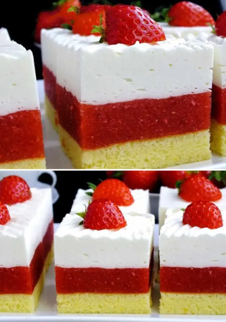 Fantastic strawberry slices with whipped cream – airy sponge, two layers of jelly and a light cream recept
