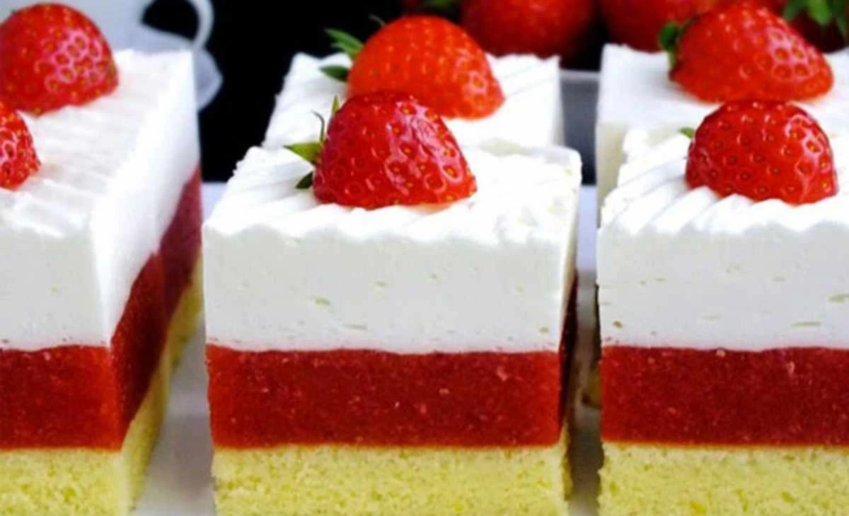 Fantastic strawberry slices with whipped cream – airy sponge, two layers of jelly and a light cream recept