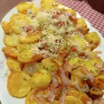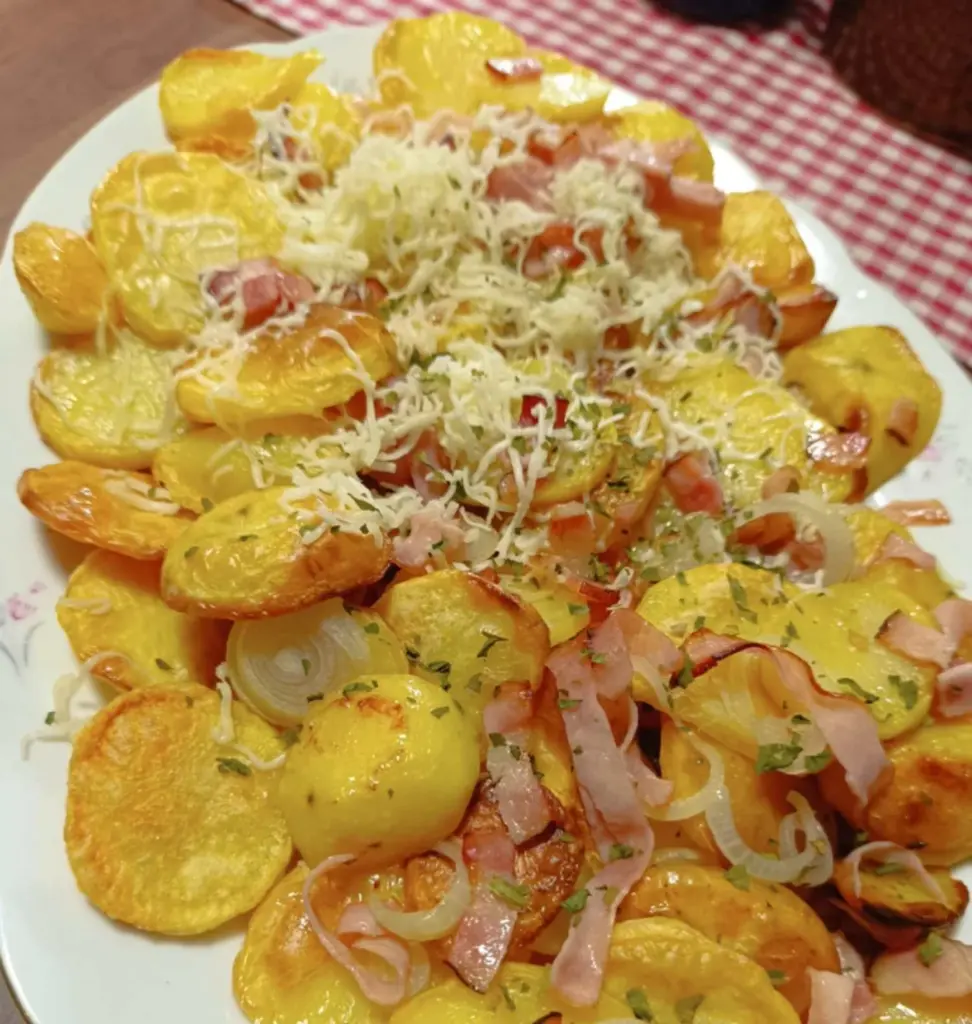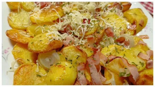 Farmhouse potatoes with bacon, ham and cheese are a reliable ‘sheet-pan’ recipe for the whole family. With a few available ingredients you can create a juicy and delicious dish with crispy edges that easily adapts to your pantry. Add it to the weekly menu – just slice, par-bake, top and briefly bake.