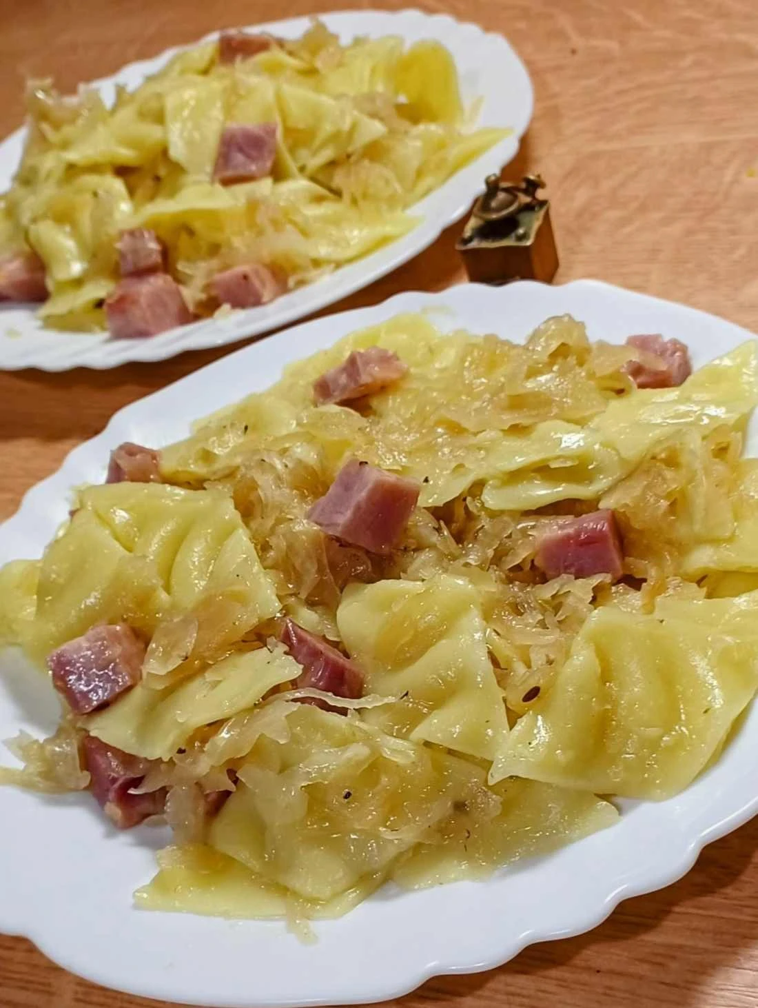 This simple but tasty dish combines wide homemade pasta (fleky) with gently stewed sauerkraut and pieces of smoked pork knuckle. Thanks to the tangy sauerkraut, fragrant onion and the pronounced flavor of the smoked meat, this dish becomes a beloved family evening classic that will satisfy even the biggest appetites.