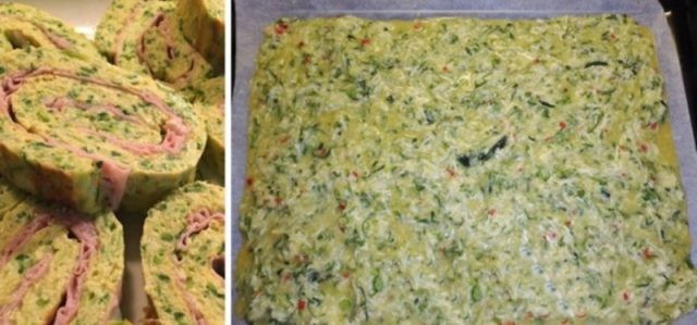 - Filling: Once the zucchini batter is baked and slightly cooled, spread it with cream cheese, quark or your favorite spread. Place the slices of ham on top.