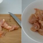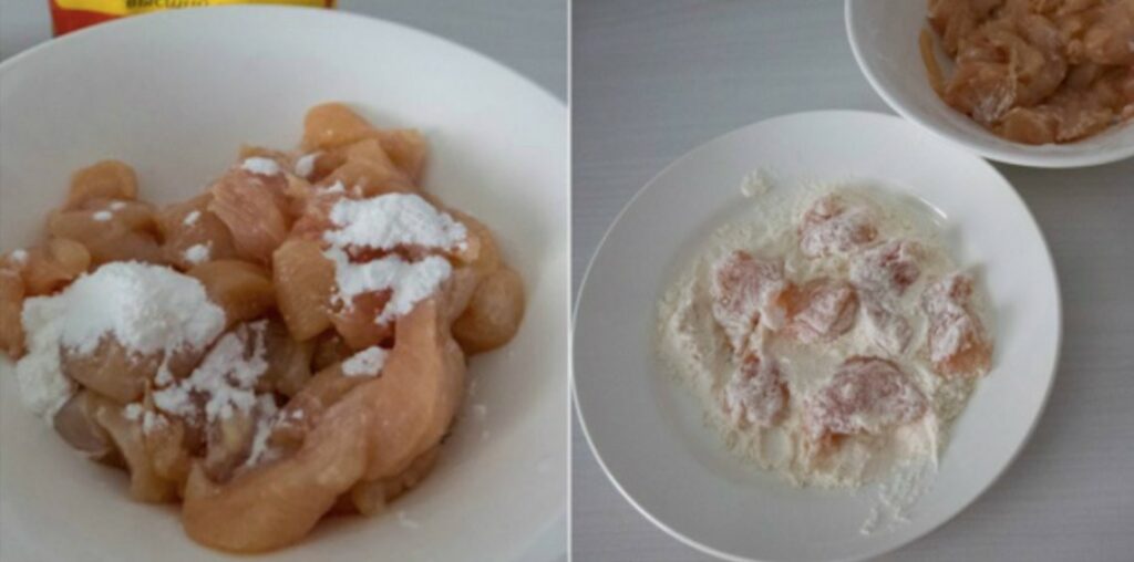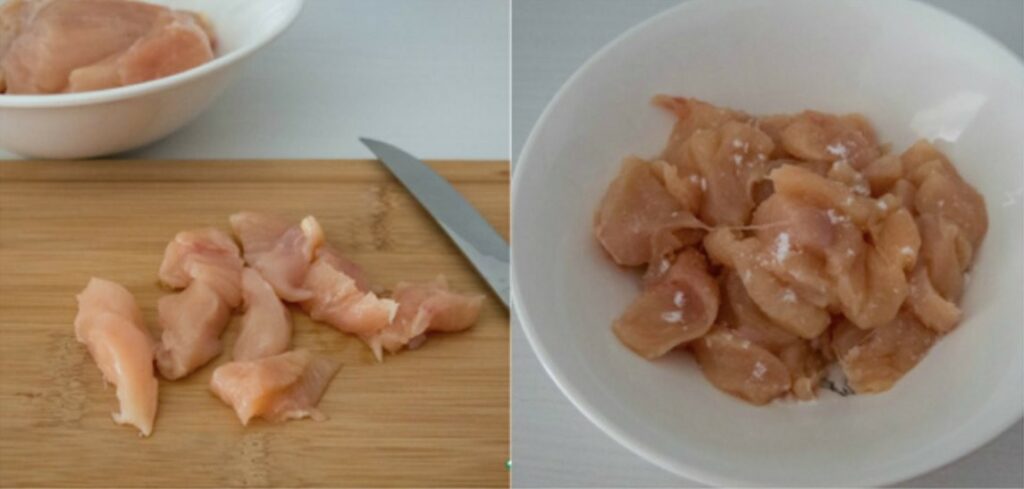 • First wash the chicken breasts, dry them and remove the membranes. Cut them into pieces of any size. You can either prepare traditional cutlets or small nuggets.