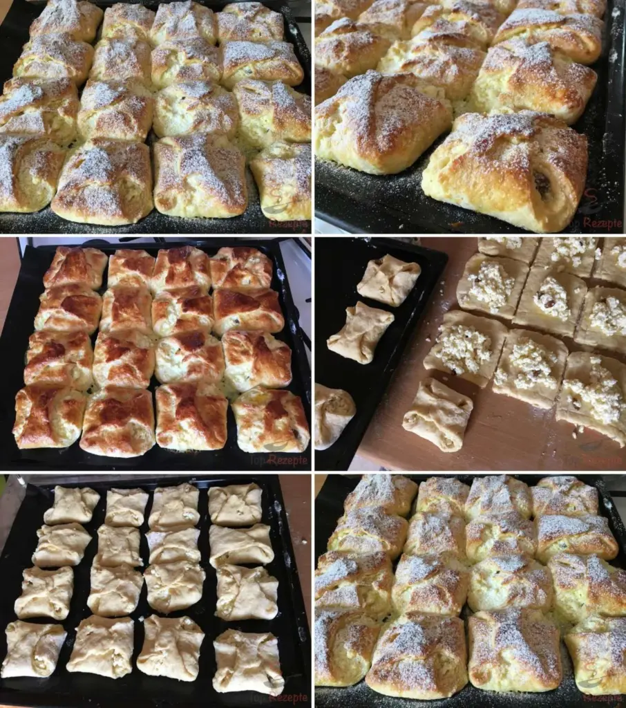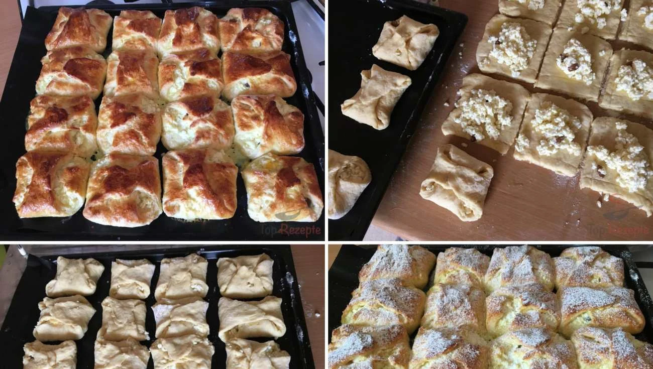 Grandma’s curd cheese pastries are exactly the kind of baked good that smells like home. Thanks to the combination of two flours the dough is airy yet holds its shape well. The filling with lemon zest and raisins gives the classic flavor a little kick. Bake a double batch right away – they disappear faster than they cool.