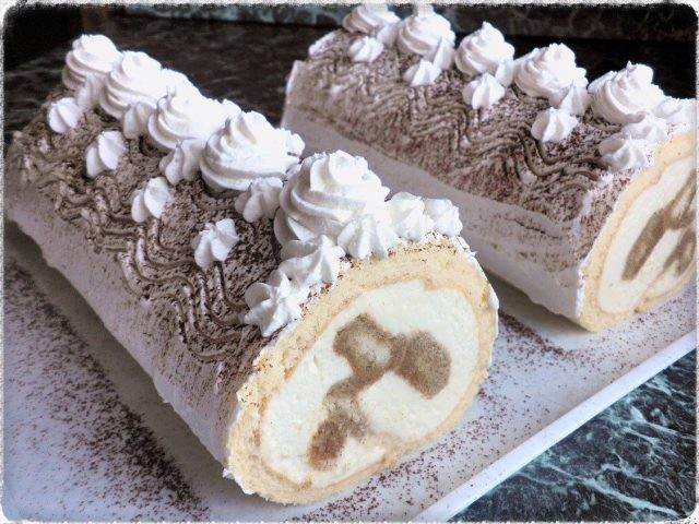 - Assembling the roulade: Spread the prepared cream over the cooled cake sheet. Soak the ladyfingers in the strong coffee mixed with Amaretto and arrange them on the cream in three rows along the length of the sheet. Using the parchment paper, begin to roll the cake and gradually tighten it to form a firm roulade. Spread the finished roulade with the instant whipping cream prepared according to the package instructions, and sprinkle with cocoa. You can decorate it with the remaining whipped cream as you wish.