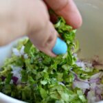 • Cut about 6 cherry tomatoes, peel and chop the onion and garlic, and also chop a little cilantro.