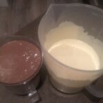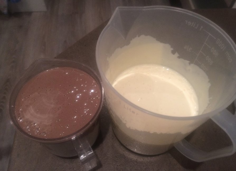 - Divide the resulting mixture into 2 parts (one larger, the other smaller) and add 2 tablespoons of cocoa to the smaller one.