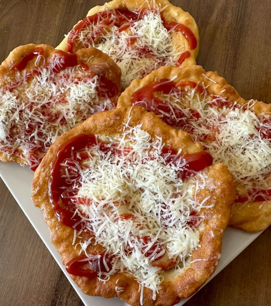 • Seasoning: While still warm, lightly salt the langoš, brush with garlic oil, spread with sour cream or ketchup and sprinkle with grated cheese.