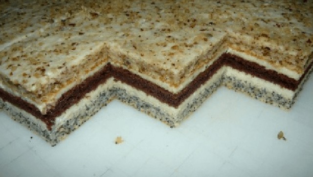 - Assembling the cake: Spread part of the cream onto the poppy seed layer, cover with the cocoa layer, spread another part of the cream, then add the nut layer and finish with the remaining cream.