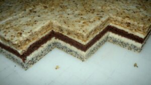 • Cream: In a small saucepan mix the ground walnuts, sugar and starch. Pour in the milk and heat over low heat until the mixture thickens. Let it cool completely and then whisk in the softened butter. Spread the resulting cream over the cooled sponge cake base.